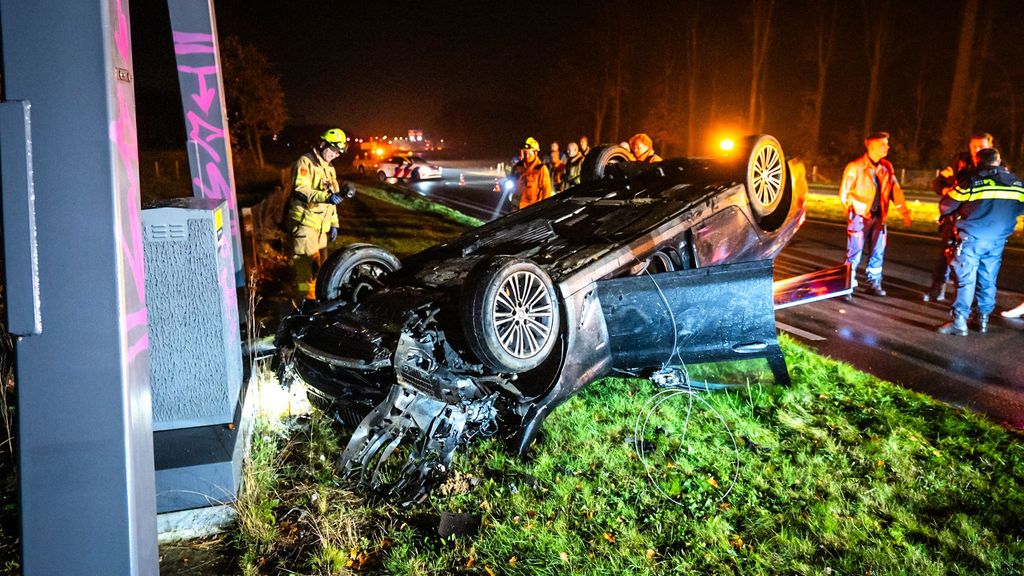 De auto raakte rond 2.15 uur van de weg, sloeg over de kop en kwam op zijn dak tot stilstand tegen een paal van de matrixborden. De klap was hard. De wagen is vermoedelijk total loss. Een bergingsbedrijf heeft het voertuig weggehaald.